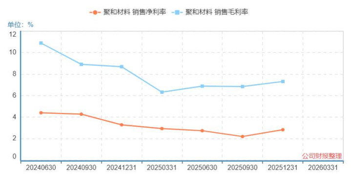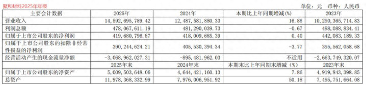 最新财报数据显示,2025年聚合材料实现营收近146亿,同比增长16.9%;实现净利润4.2%,同比增长0.4%。