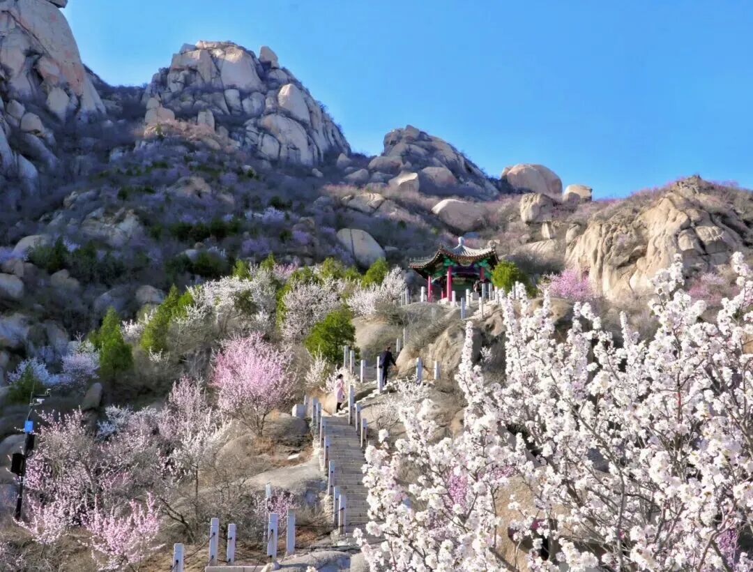 核心花种:杏花(核心观赏区)、山桃花、连翘,搭配零星玉兰,3月下旬-4月中旬为最佳观赏期,杏花初花期娇艳、盛花期淡雅,山桃花粉嫩灵动,层次丰富,是拍照出片的核心路线。