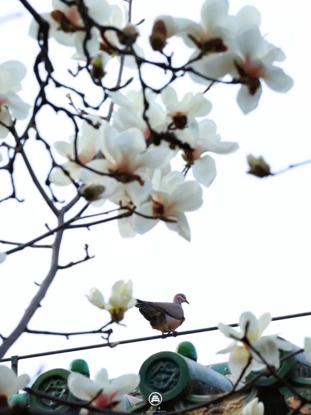 紫玉兰缀枝,粉樱映青砖,青松衬古建